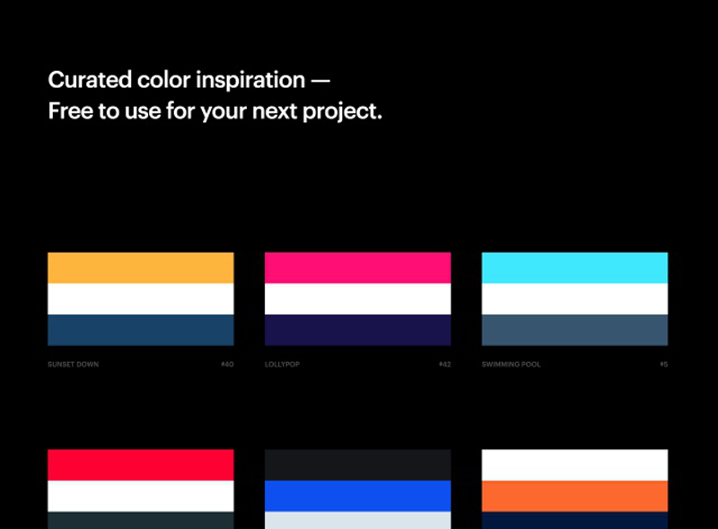 開啟 Colorinspire.io 網(wǎng)站后可以看到各個顏色組合,目前約有45 種,每一個組合都由三種顏色構成,下方還會有配色名稱和編號。